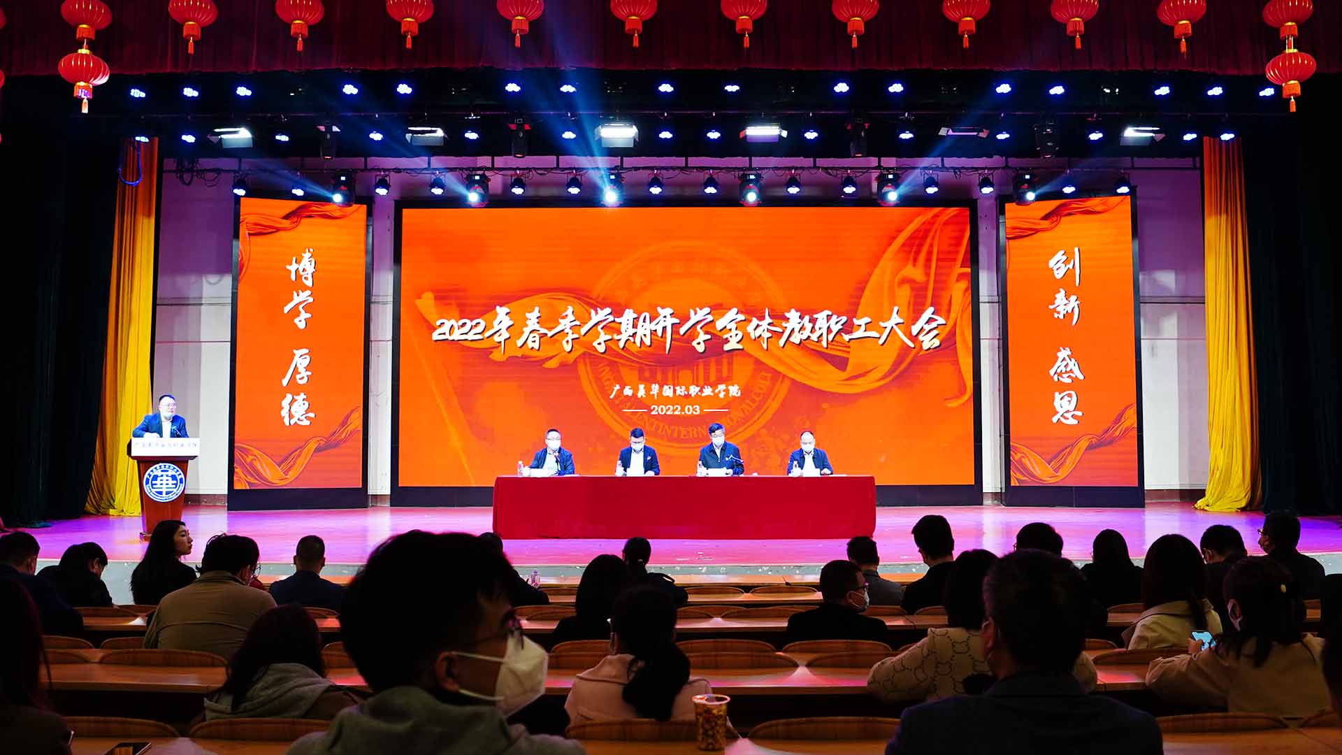为进一步凝聚共识,统一思想,明确方向,2022年3月1日,广西英华国际职业学院2022年春季学期全体教职工大会在报告厅举行,主要任务是回顾2021年成绩,表彰先进工作者,安排部署2022年工作。学校校长邹利斌、常务副校长柴新卫、校长助理宋博、监事会主席钟伟及全体教职工出席大会。校长助理宋博主持会议。
