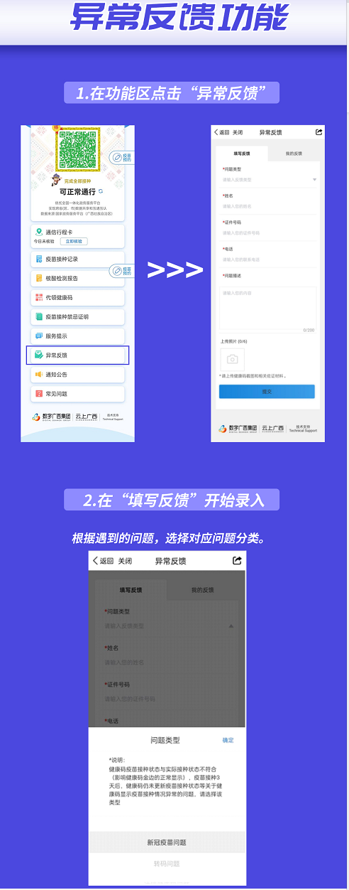 1.通过广西健康码“异常反馈”功能、12345政务服务热线、所在市县(区)指挥部等渠道反馈。