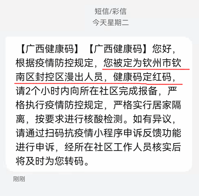 对被赋予红码或由绿码转为红码的人员,广西健康码系统根据红码定码和转码规则对相关人员进行转码后,会同步发送短信通知给红码人员,并告知原因。如下图所示: