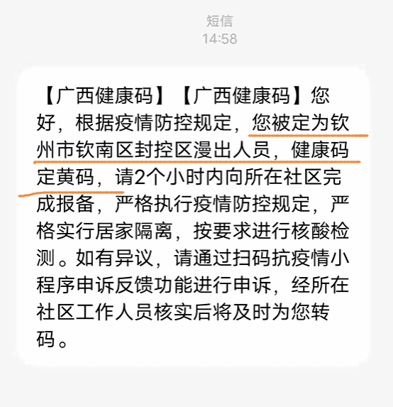 符合黄码转码条件被自动转码的黄码人员,广西健康码系统根据黄码定码和转码规则对相关人员进行转码后,会同步发送短信通知给黄码人员,并告知原因。如下图所示: