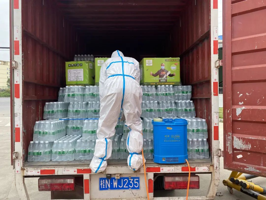 (捐赠的矿泉水和口罩到达校外物资接收消杀点)