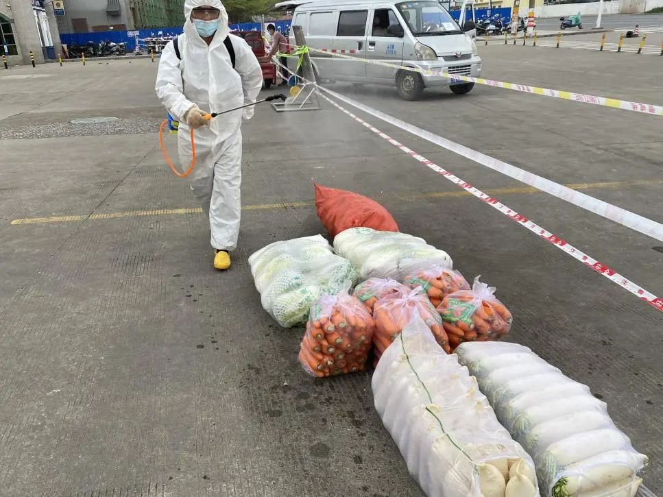 (我校后勤工作人员接收蔬菜后进行统一消杀)