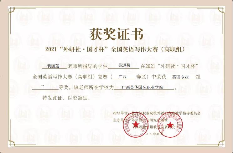 近日,2021“外研社·国才杯”全国英语写作大赛(高职组)广西赛区复赛落下帷幕。经过与区内同类院校学生的激烈竞争,国际学院2020级商务英语专业学生吴道菊获专业组二等奖。指导老师裴丽莲老师获得优秀指导老师荣誉。