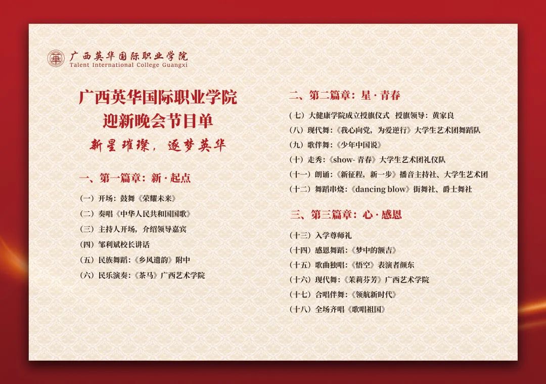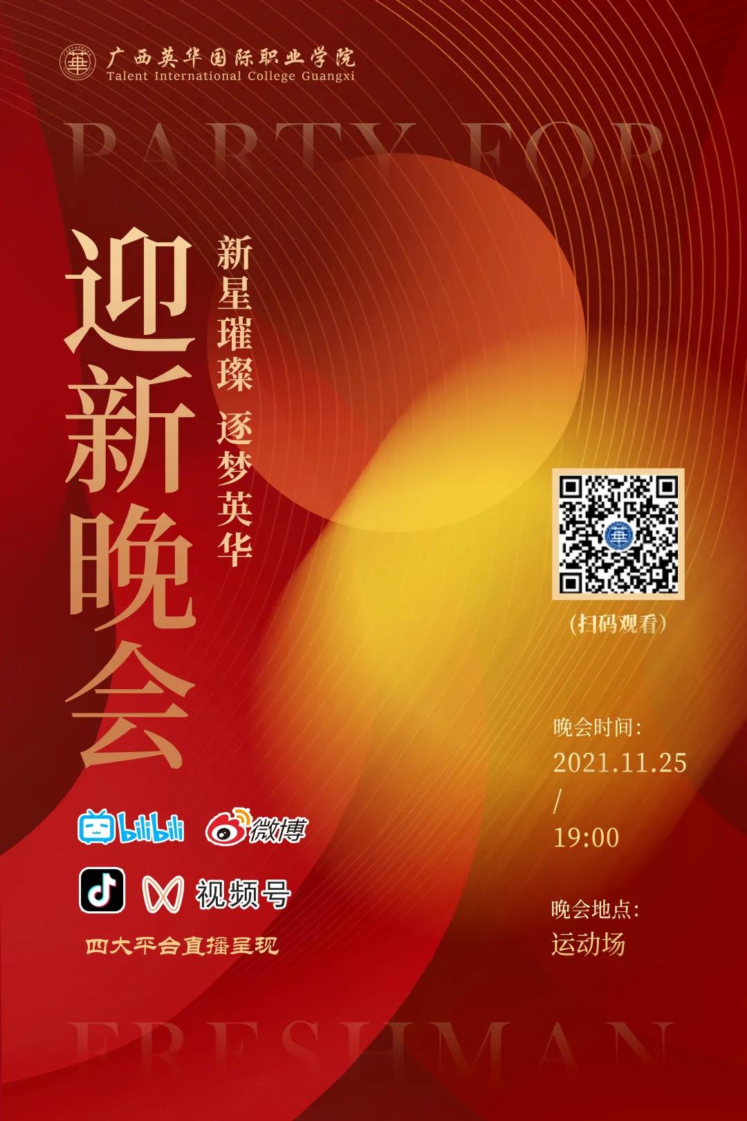 广西英华国际职业学院2021年迎新晚会将于2021年11月25日(星期四)晚上7点在新运动场隆重开幕。届时除了现场观看外,还将同时在官方抖音、视频号、新浪微博、B站等几大平台线上同步直播,欢迎大家届时观看。