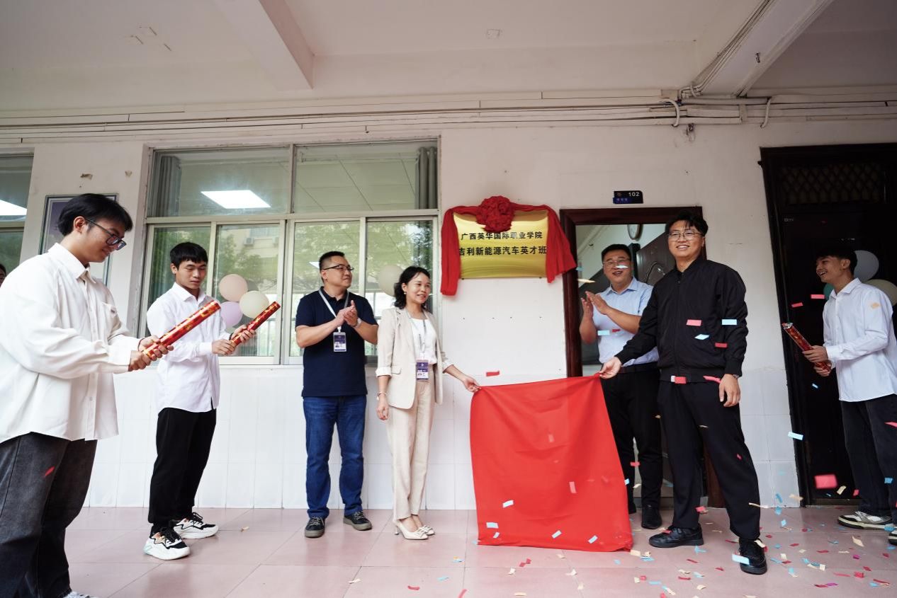 仪式上,参会人员共同为英才班揭牌,广西英华国际职业学院智能与机电工程学院第一届吉利新能源汽车“英才班”顺利开班!
