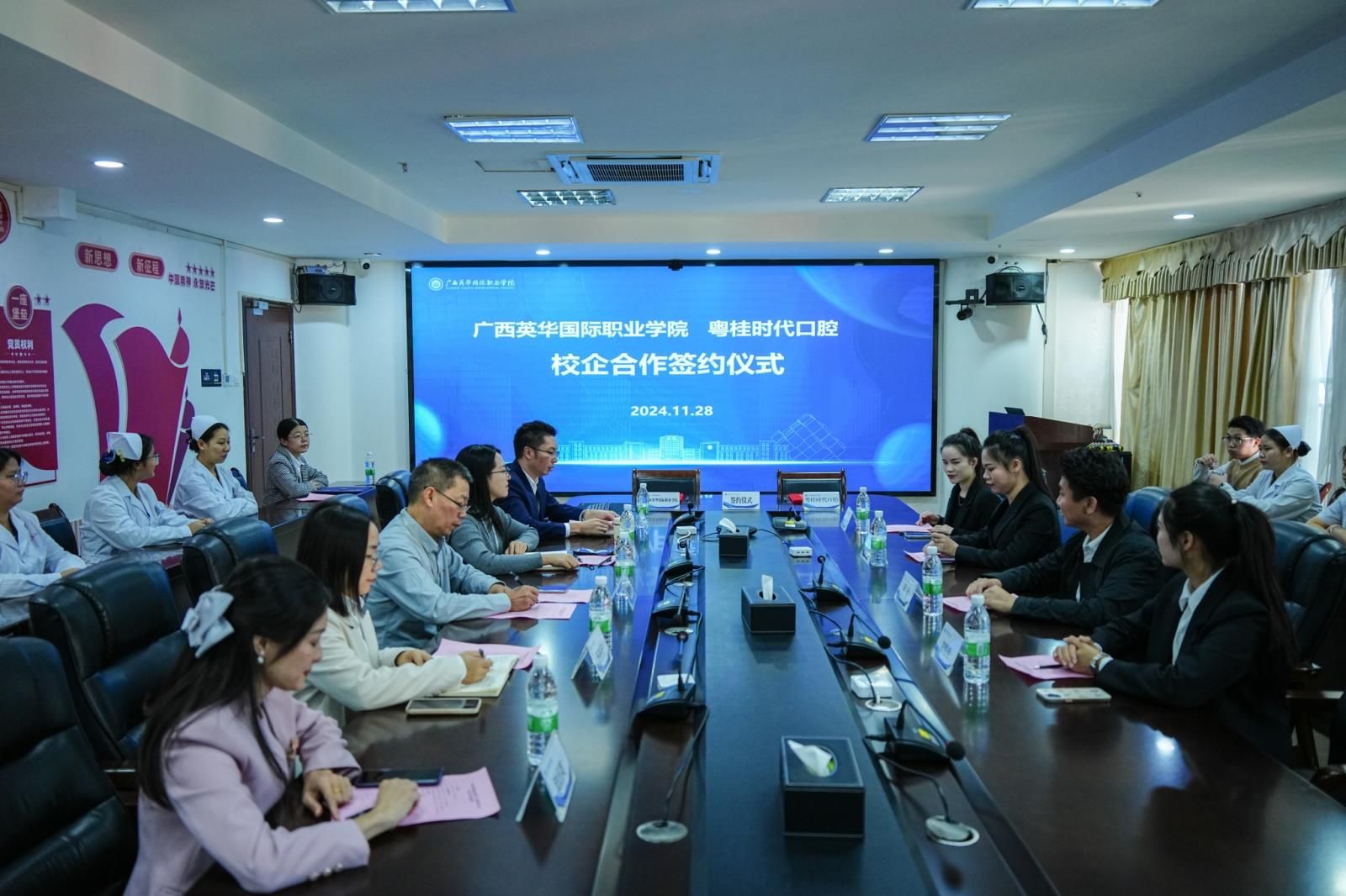 广西英华国际职业学院党委书记黄家良、副校长宋博、校长助理丁雪萍、大健康学院常务副院长谢绍辉、护理系主任陆远英,粤桂时代口腔总经理利远、行政院长罗婷等出席协议签约仪式、基地和英才班揭牌仪式等相关活动。