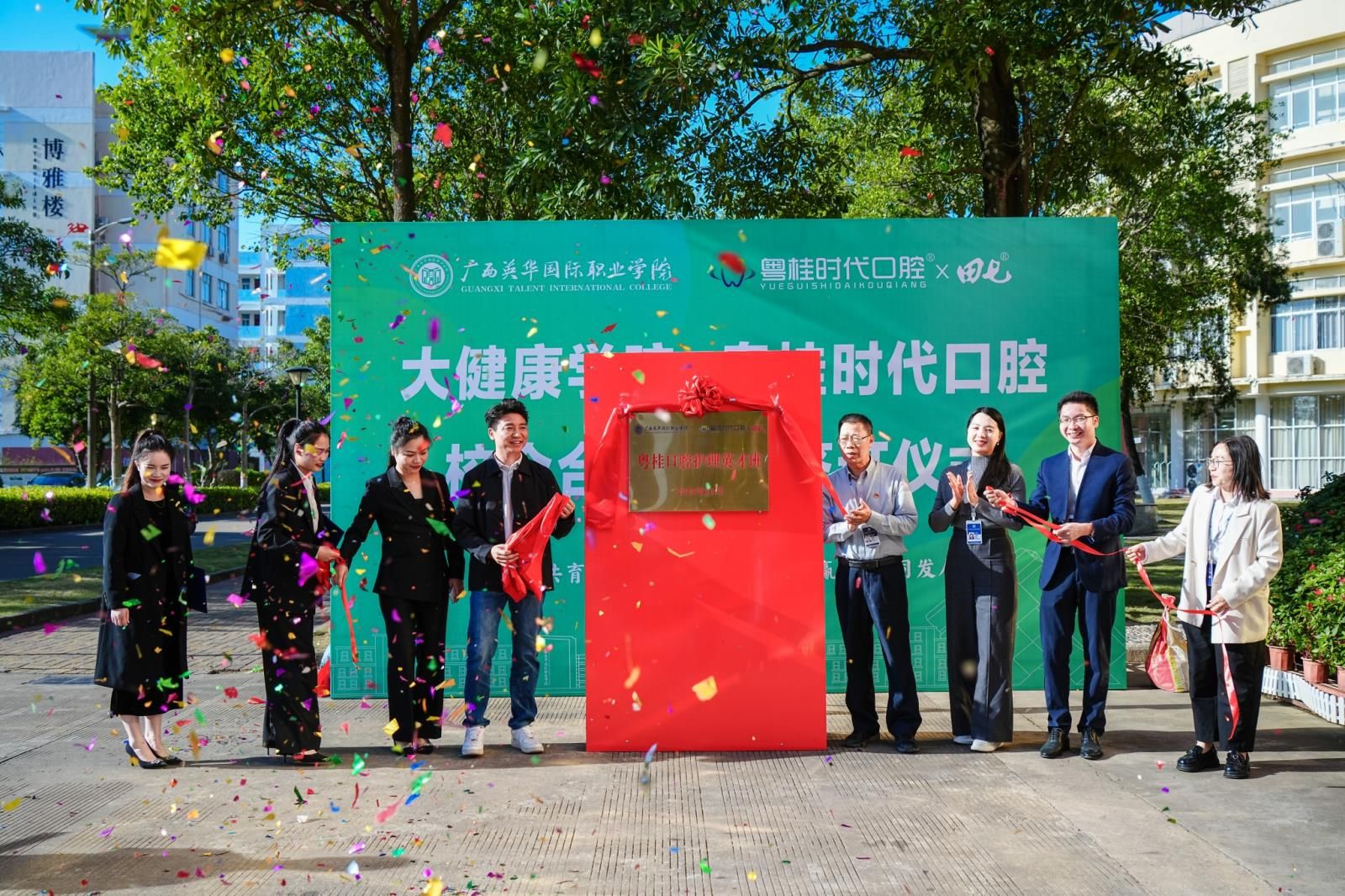 签字仪式结束后,双方代表来到践行楼前,举行“粤桂时代口腔护理人才培养基地”及“粤桂时代口腔护理英才班”揭牌仪式。这一仪式标志着双方将在人才培养、实训基地建设等方面展开深入合作,共同推动口腔护理人才的培养和发展。