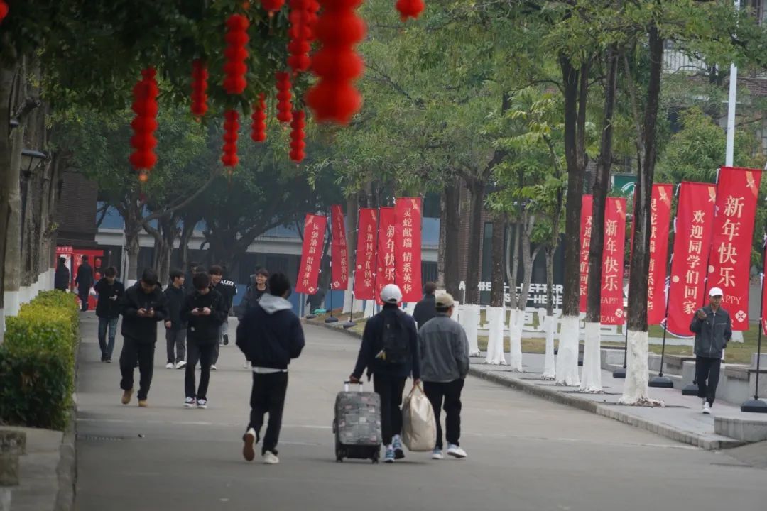 踏入校门的那一刻,新春红色为主色调的装饰在阴雨中显得格外醒目。广场上高大的新春立牌,传统吉祥图案在雨幕中若隐若现,传递着新春的美好祈愿。校道旁的道旗在微风中轻轻摆动,红色旗帜上写着“欢迎同学们回家”“新年快乐”“灵蛇献瑞,情系英华”等字样,传递着学校对同学们深深的思念与祝福。