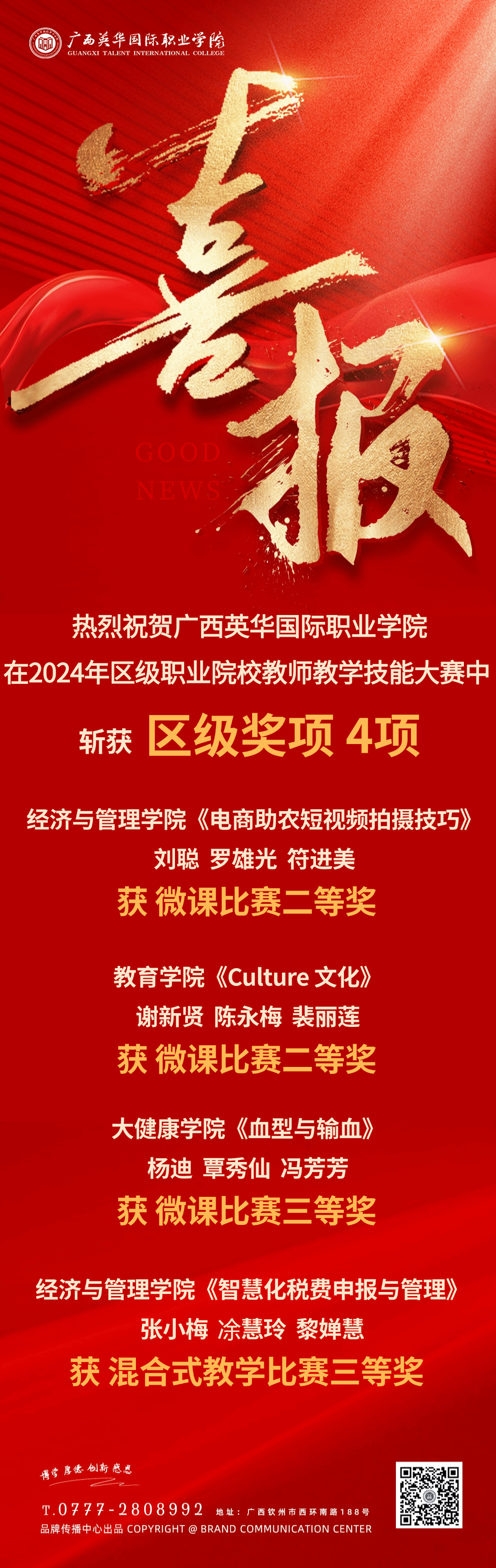 近日,自治区教育厅公示2024年广西职业院校教师教学技能大赛混合式教学比赛及微课教学比赛获奖名单,广西英华国际职业学院教师团队凭借出色的教学能力,斩获混合式教学比赛三等奖1项,微课教学比赛二等奖2项、三等奖1项,充分展现了学校教育教学质量和办学水平的显著提升。