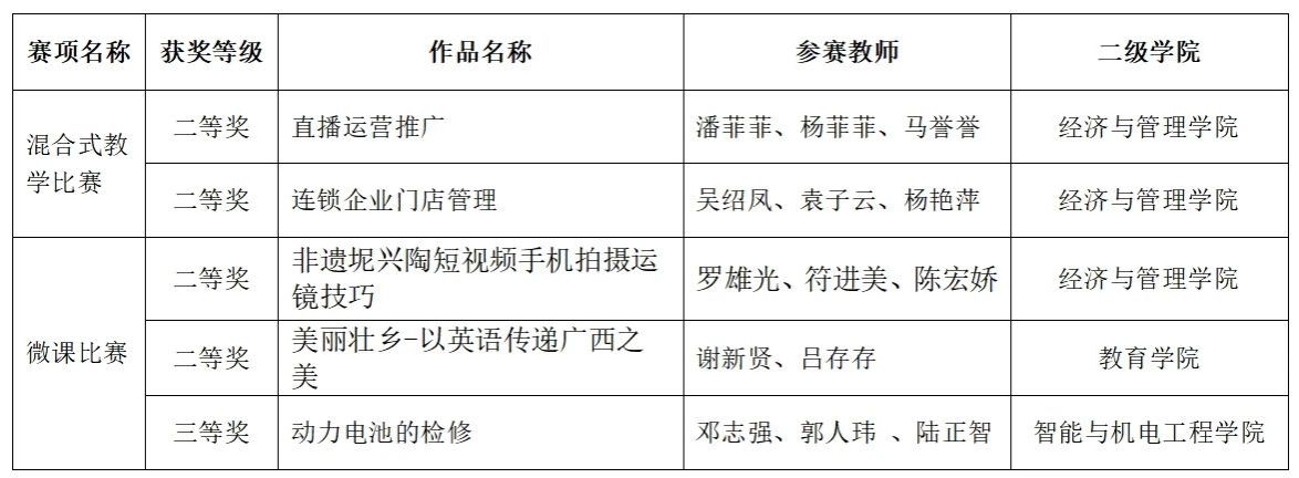 近日,广西职业院校教师教学技能大赛组委会公布了关于2023年度广西职业院校教师教学技能大赛混合式教学和微型课程教学竞赛的获奖评审结果。在此次竞赛中,广西英华国际职业学院在混合式教学环节取得了两项二等奖的佳绩,成为民办高等院校中唯一荣获该类奖项的代表!此外,微型课程教学竞赛项目也刷新佳绩,获得了包括二等奖和三等奖在内的多个奖项。值得一提的是,学校报送的五份参赛作品成果斐然,全部荣获各类奖项!