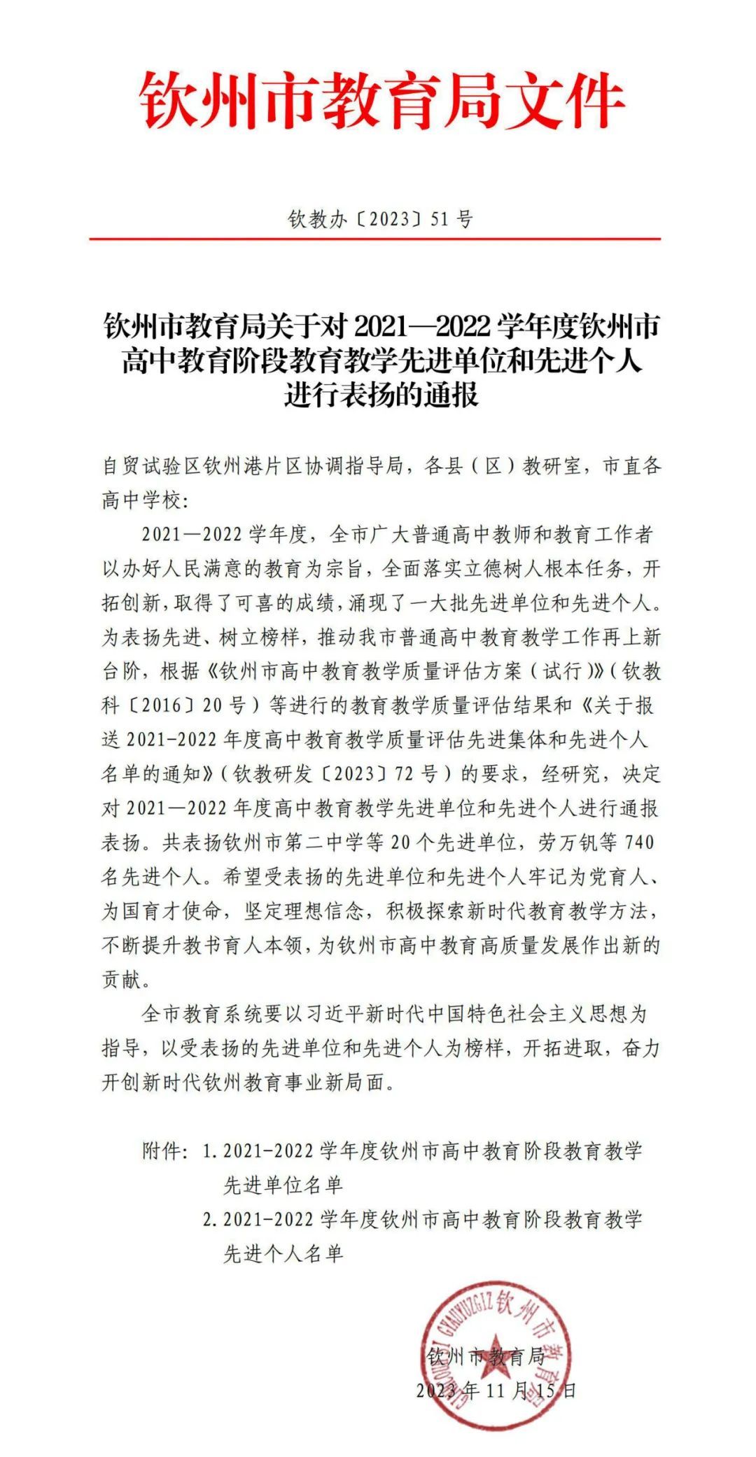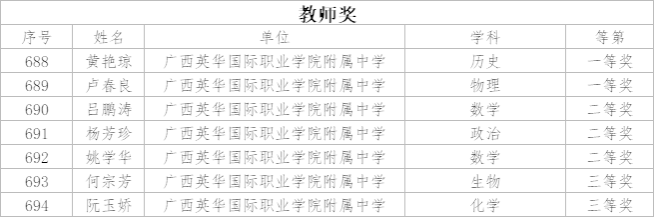 近日,钦州市教育局公布了2021-2022 学年度钦州市高中教育阶段教育教学先进单位和先进个人获奖名单。广西英华国际职业学院附属中学7名教师荣获先进个人称号。其中,黄艳琼获历史一等奖、卢春良获物理一等奖、吕鹏涛获数学二等奖、杨芳珍获政治二等奖、姚学华获数学二等奖、何宗芳获生物三等奖、阮玉娇获化学三等奖。