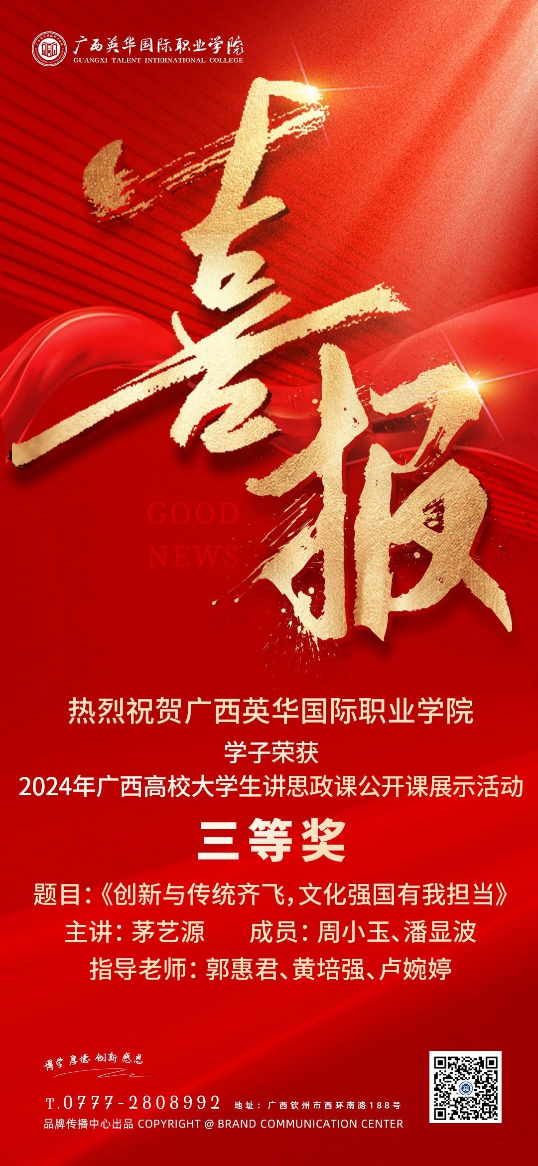 11月11日,自治区教育厅公布2024年广西高校大学生讲思政课公开课展示活动获奖作品名单,学校由郭惠君、黄培强、卢婉婷老师指导,茅艺源、周小玉、潘显波同学参与的《创新与传统齐飞,文化强国有我担当》作品获比赛三等奖,充分体现了学校师生对思政教育的重视与热情,也展示了学校在思政教育方面的创新与实践成果。