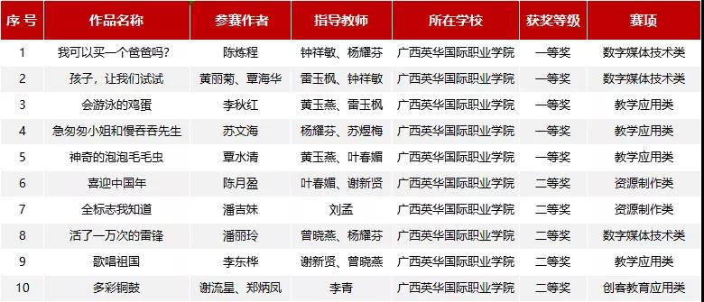广西英华国际职业学院在2021年全国大学生信息技术应用创新与实践大赛荣获佳绩,教育学院学前教育专业学生分别获得一等奖5项,二等奖5项。大赛由全国高等学校计算机教育研究会、新科技与继续教育分会组织,旨在提升师范生现代教学技术应用能力。