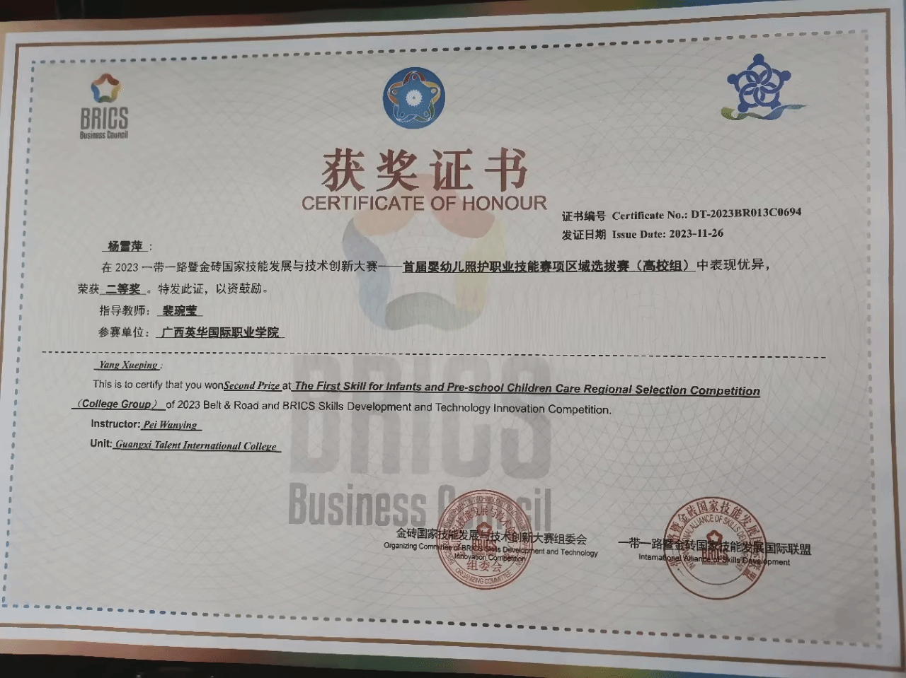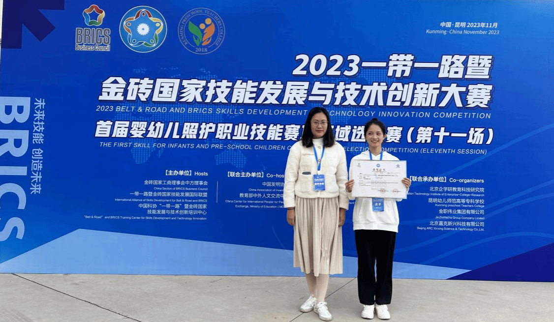 11月26日,2023一带一路暨金砖国家技能发展与技术创新大赛首届婴幼儿照护职业技能赛项区域选拔赛(第十一场)圆满落下帷幕。教育学院裴琬莹老师指导的2022级婴幼儿托育服务与管理专业学生杨雪萍荣获二等奖,同时获得代表广西参加该项赛事的国赛资格。