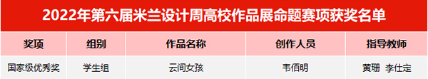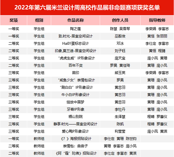 第六届“米兰设计周——高校设计学科师生优秀作品展”命题赛及非命题赛评审工作已经全部结束,全国共计有30个赛区近3万余件作品参赛,经过作品筛查、专家评审团初评、终评等环节,分别评选出省赛一二三等奖及命题赛国家级一二三等奖。我校建筑与设计学院师生喜获佳绩,全院共获得19项荣誉,其中国家级优秀奖1项,省级一等奖3项,省级二等奖4项,省级三等奖9项。省赛获奖作品将继续进入全国总决赛评审,期待他们在国赛中获得更好的成绩。