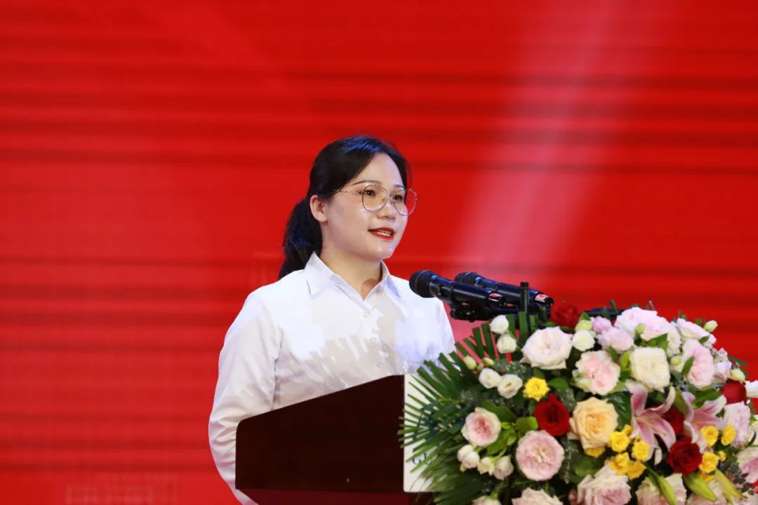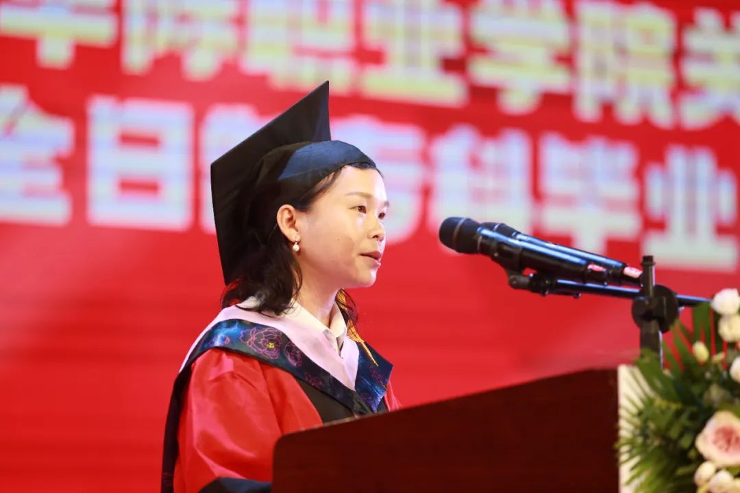 教师代表杨菲菲上台发言,作为一名青年教师,她以自己读书的经历勉励毕业生们要永远怀揣梦想、勇攀高峰,保持对知识的渴望和独立思考的能力;保持对生活的热情,永远怀揣勇气和热情。最后,她祝愿同学们:愿你们征服高山,踏过泥泞,在人生的旅途中不断求索,请用更开放,更包容,更向上的心态去拥抱这个世间的种种美好。
