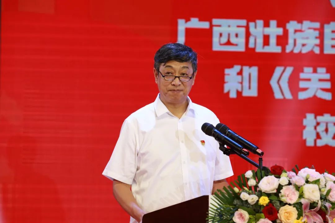 广西英华国际职业学院校长邹利斌、党委书记黄家良、监事会主席钟伟、常务副校长柴新卫、副校长宋博、副校长赵春辉、各二级学院院长,分管学生工作的副院长以及各职能部门负责人和老师、同学代表齐聚图书馆三楼报告厅参加毕业典礼活动。