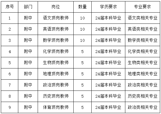 1.本科及以上学历,语文、数学、英语、政治、历史、生物、化学、地理、体育等专业学科,师范院校毕业优先;