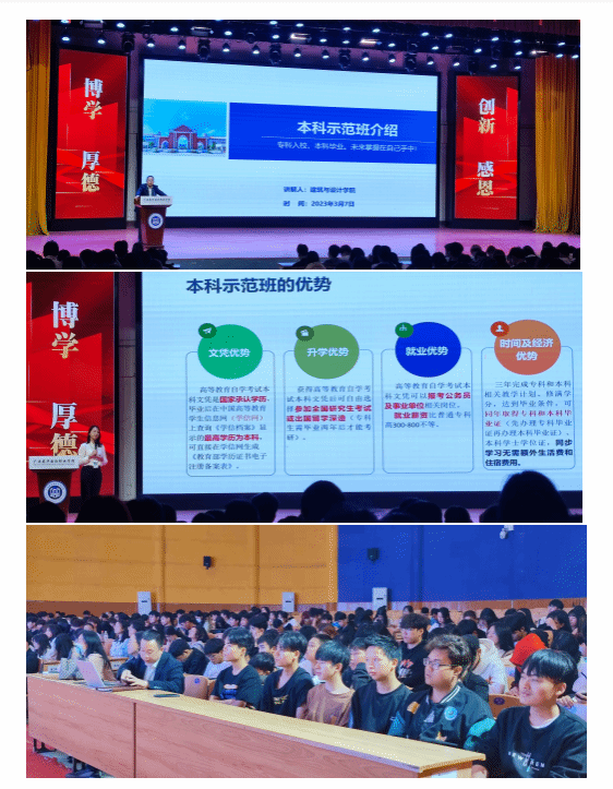 (八)为宣传本科示范班相关政策、助力我校学生提升学历,3月7日17:00—18:00,建筑与设计学院组织2022级学生331人在图书馆三楼报告厅开展本科示范班宣讲活动。建筑学院院长韩国栋、书记张丽丽、系主任程晴以及辅导员参加宣讲会。本次宣讲由继续教育学院院长丁雪萍主讲,从大学生职业生涯、专业发展前景、考试课程、证书含金量、自考本科通过率等方面进行宣讲动员。接下来将协同二级学院一起组织学生报名,做好招生服务工作。