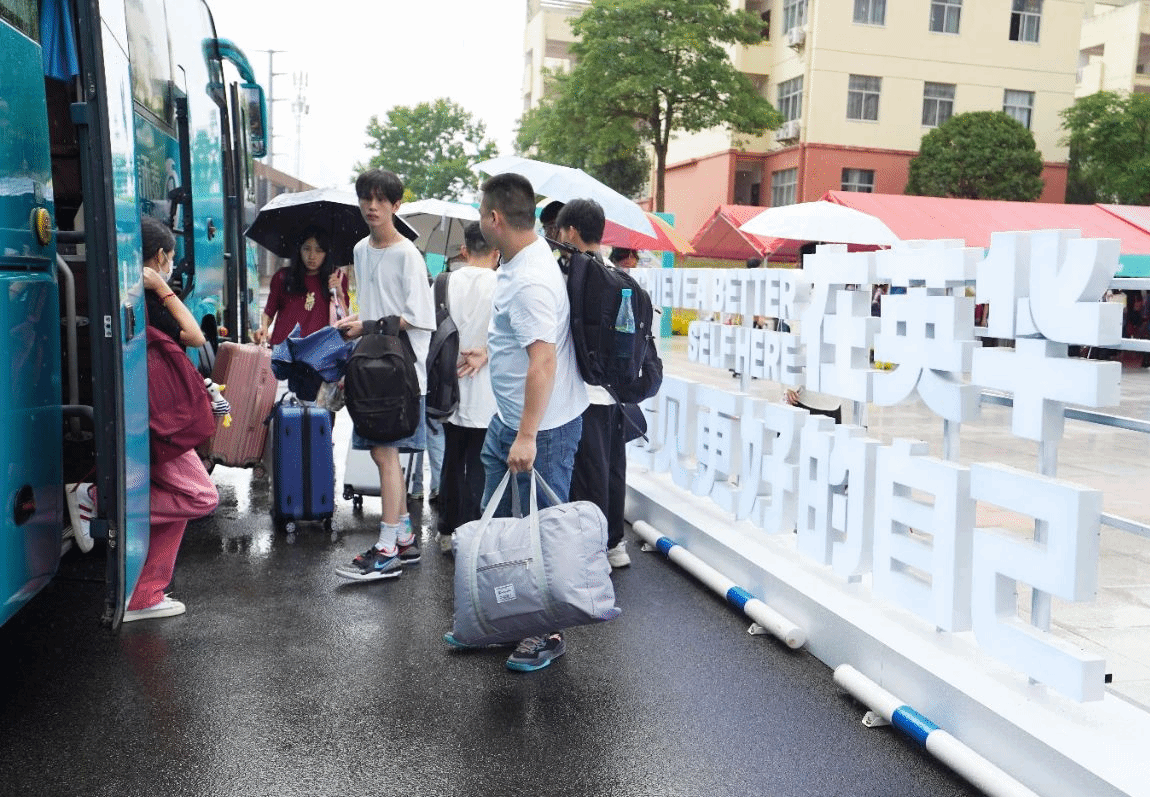 学校在钦州东站出口、钦州总站均设立了迎新接待点“一站式报到”服务点全天候到位一辆辆大巴分批次接英宝们到校