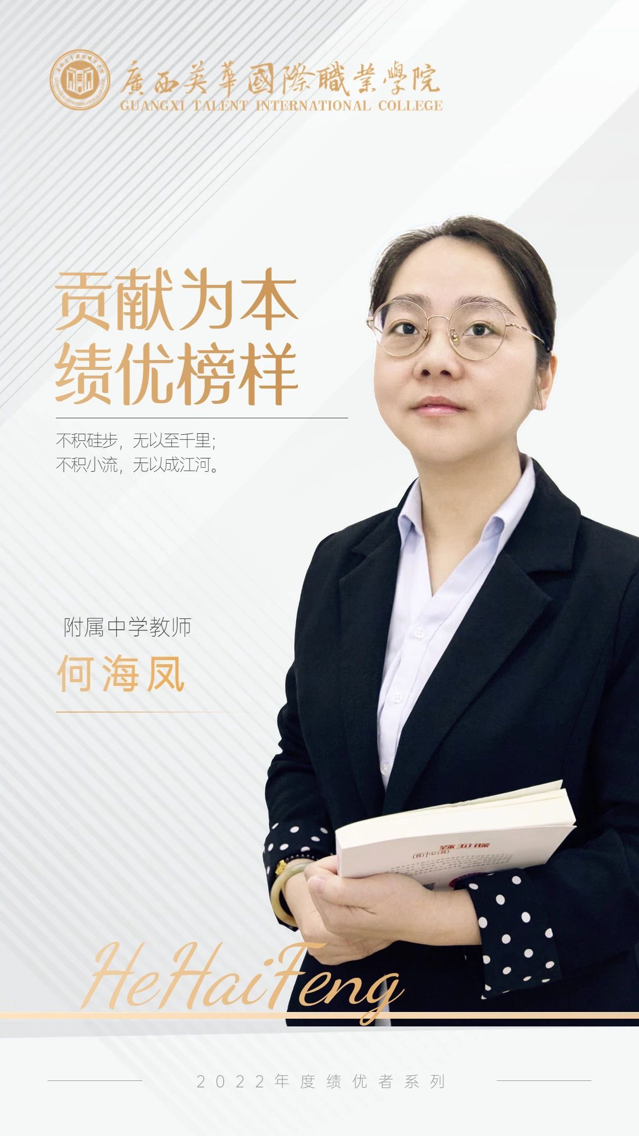 广西英华国际职业学院附属中学一级教师,从事语文教学20年,入职英华至今5个年头,连续三年兼任班主任工作,每年担任重点班的教学工作。2022年春季学期黑板报获“最佳指导老师奖”优秀奖;2022年春季学期拔河比赛获“优秀组织奖”;2022年指导学生参加校级主持人大赛获一等奖;2022年春季班主任满意度一等奖;2021年春季学期荣获市期末教学质量二等奖;2021年秋季一模统考教学质量三等奖;2021年秋班主任满意度三等奖;2021-2022学年中,每月均获得优秀班主任称号,荣获年度优秀班主任一等奖;2018年春季学期荣获市期末教学质量二等奖;2019年秋季学期荣获市期末教学质量二等奖。