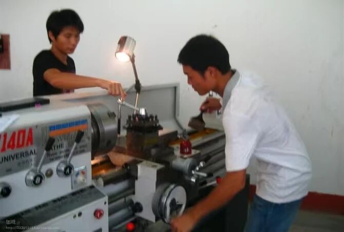 ▲广西英华国际职业学院优秀校友陈宏源(右一)在学校汽车实训室金工实习