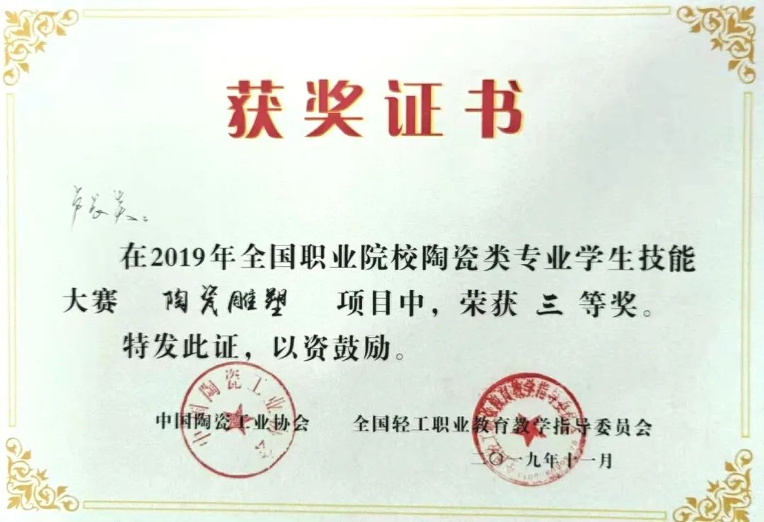 曾获得2019年广西艺术美术2019年广西工艺美术作品“八桂天工奖”荣获金奖。2019年“百花杯”中国工艺美术精品奖;2019年全国职业学校陶瓷类专业学生技能大赛陶瓷雕塑项目中,荣获三等奖;获得一次国家奖学金,一次国家励志奖学金。