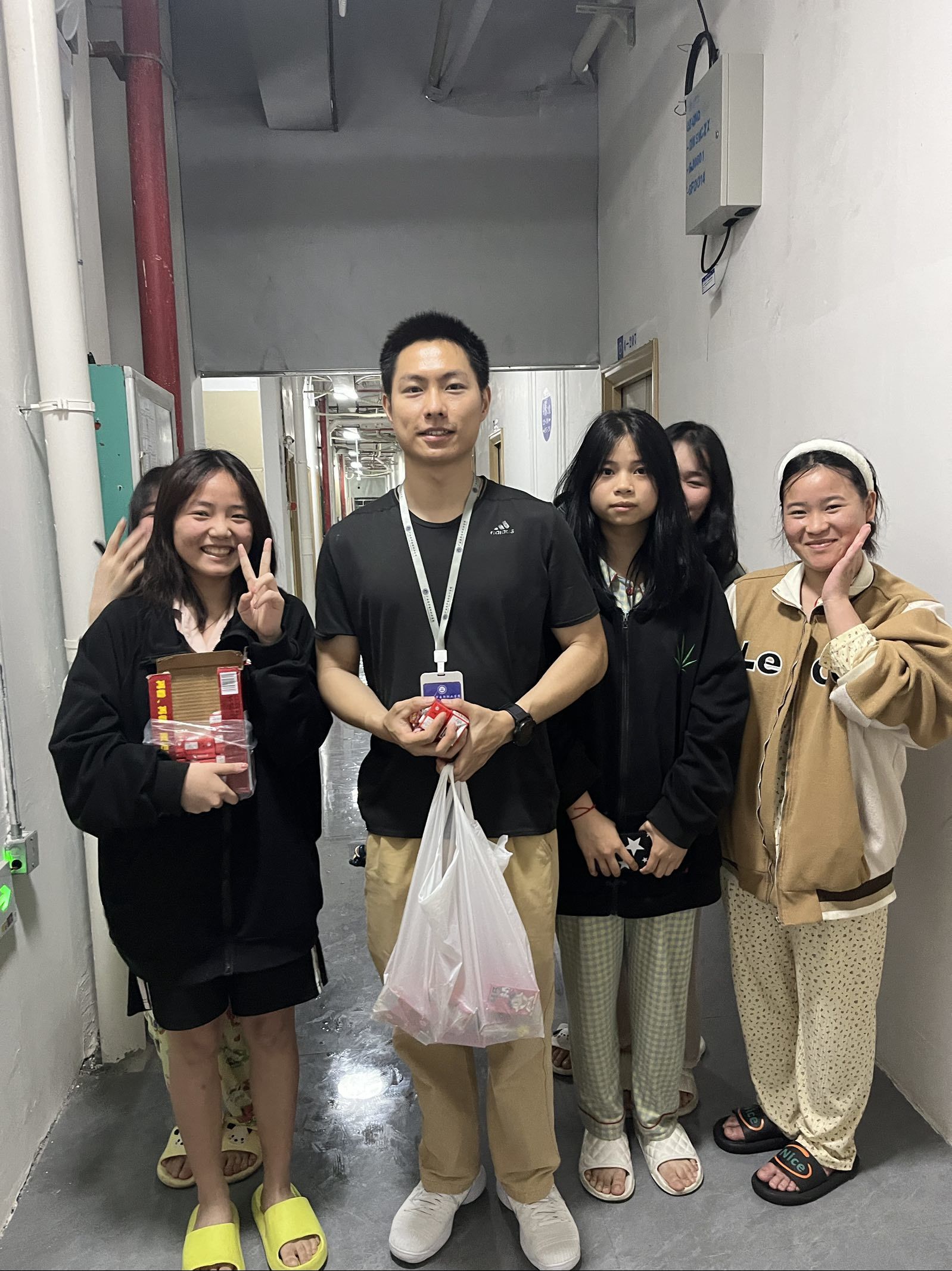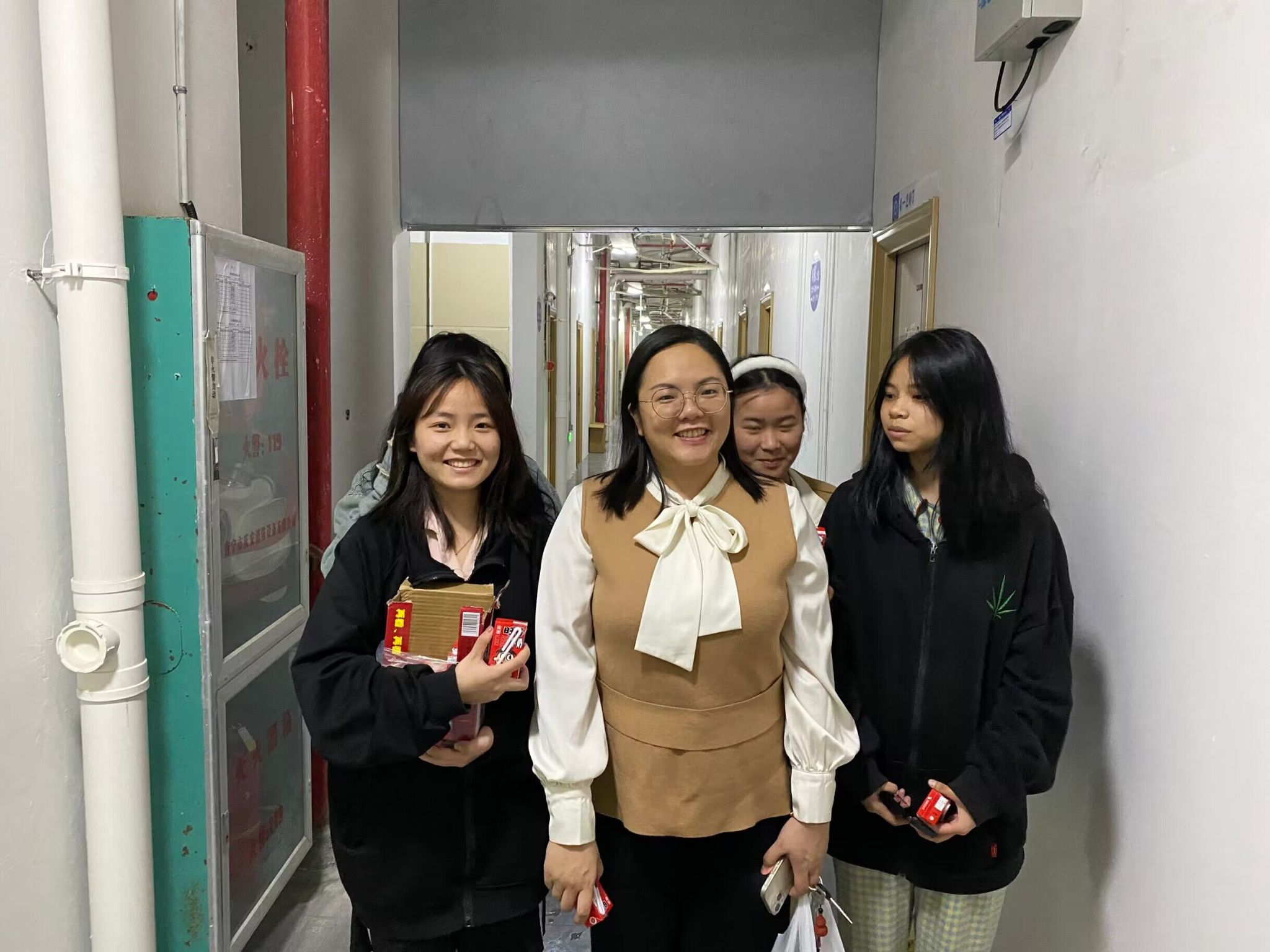 叶泫蠲院长和辅导员吴罗瑞麟为南校区的女生送去暖心的小礼物。