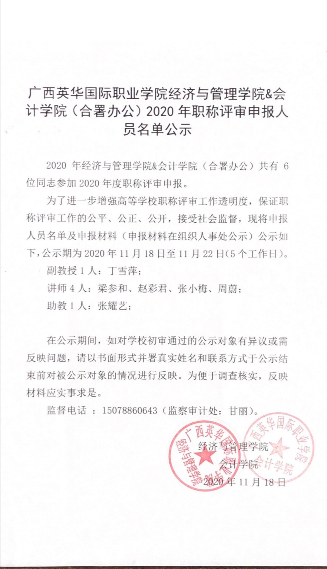 广西英华国际职业学院经济与管理学院&会计学院(合署办公)2020年职称评审申报人员名单公示