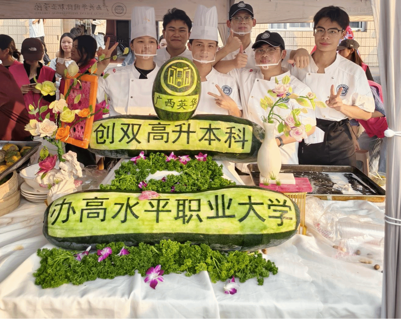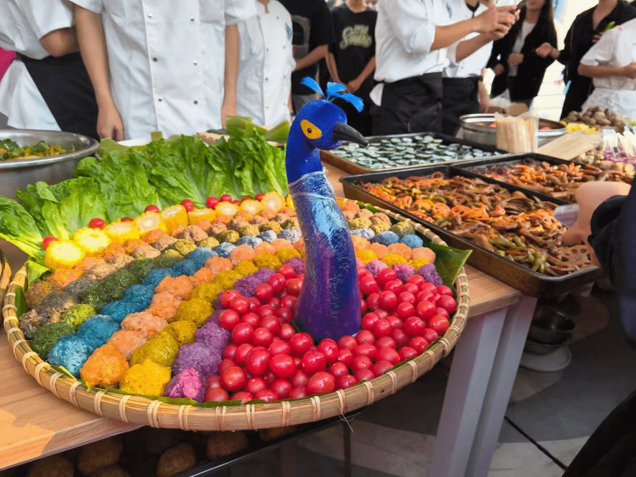 斑斓千层糕、卤味、杂粮等美食也纷纷亮相,每一道都饱含着学生们对传统美食的独特诠释。特别值得一提的是,现场还呈现了水果茶和芋泥糖水等创意美食,将传统食材与现代饮品巧妙结合,为古老的非遗文化注入了新的活力。学生们精心雕刻的作品,更是活动中的亮点,精美的造型展现了高超的刀工技艺,引得众人驻足观赏。