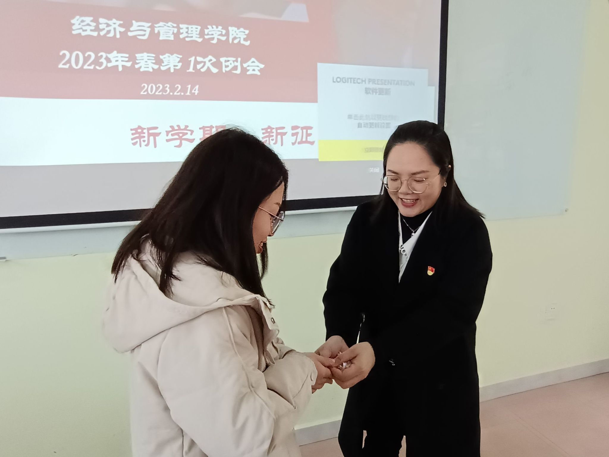 叶院长为全体党员准备了新党徽,鼓励新进教师积极入党