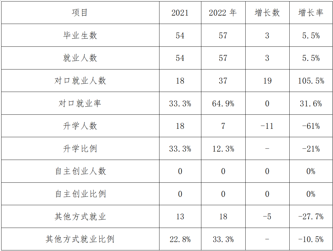 2022年应届毕业生57人,就业学生数为57人,平均就业率为100% 。直接就业人数37人,对口就业率64.9%。