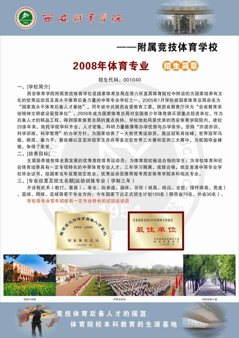 西安体育学院竞技运动学院 西安市碑林区含光北路65号 邮编:710068 联系电话:029-88409750