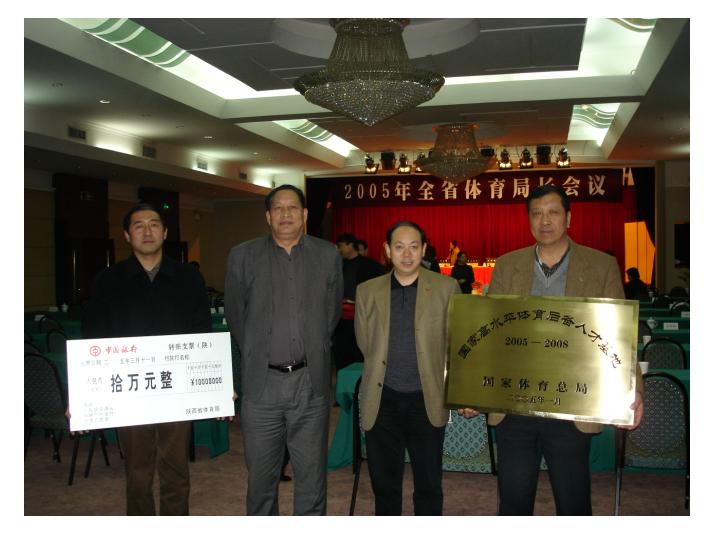 3月11日,2005年陕西省体育局长工作会议在西安召开,我院党委书记董小龙、院长李行勇以及竞技体校校长金学斌、常务副校长石勇等同志参加了会议。受国家体育总局的委托,陕西省体育局向我院竞技体校等五所单位颁发了国家体育总局授予的“国家高水平体育后备人才基地”牌匾。同时省体育局奖励五所单位各十万元,对其为陕西竞技体育所做出的贡献予以表彰。