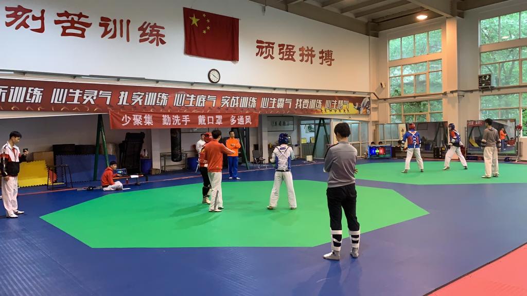 为检验今年冬训成果,进一步提高训练质量,积极备战十四运会和全国比赛,在比赛中发挥高水平竞技能力。我校于5月9日上午在跆拳道馆内举行教学实战比赛。我校备战全运会重点跆拳道运动员和一线运动员18人参加了比赛。