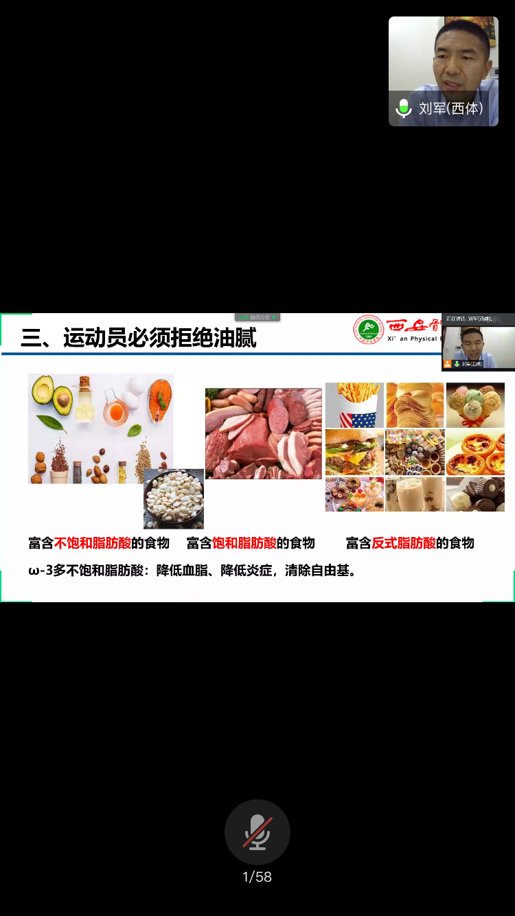 运动员科学膳食宣传教育讲座由西安体育学院运动与健康科学学院刘军教授主讲。讲座从运动员饮食碳水化合物为主的平衡饮食模式出发,详细讲解了竞技体育的初心、运动员饮食为何以碳水为主题、运动员要必须拒绝油腻、优秀运动员要学会慧选食物、饮食自律的榜样等方面。