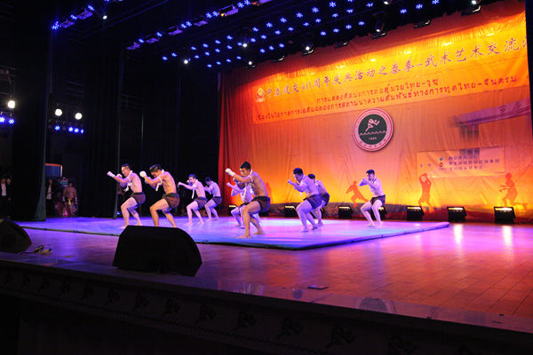当天晚上,泰国泰拳专业队和我院武术运动员在艺术馆大礼堂为观众上演了两国武艺国粹,让大家切身感受到泰拳的魅力和中国武术的博大精深。泰拳选手的飞肘、飞膝无不令观众喝彩,他们的动作连贯性很强,飞肘加鞭腿相当迅速,动作潇洒,且击打威力极大。泰拳选手编创的节目形式多样,观赏性强,还穿插了许多剧情,使在场观众对泰拳及泰国文化有了更广泛的兴趣。泰拳表演之后,我院武术系学生还奉献了精彩的武术表演:南拳气势磅礴,吐气发力,稳桥硬马,博得了一个开门红。红拳凛然风骨,形意拳进退生威,太极拳内外兼修、刚柔相济,劈挂拳长刁冷抽、吞吐开合,翻拳短打紧密、双拳翻飞,中国传统刀剑劈、刺、崩、斩、截,虎虎生风,天岐棍在长短兼施中搬、砸、扭、扣,倏忽变化……十多种武术一一登场,体现了中国武术丰厚的文化意蕴。武术系主任马文国在现场中英文解说,也博得观众阵阵喝彩。