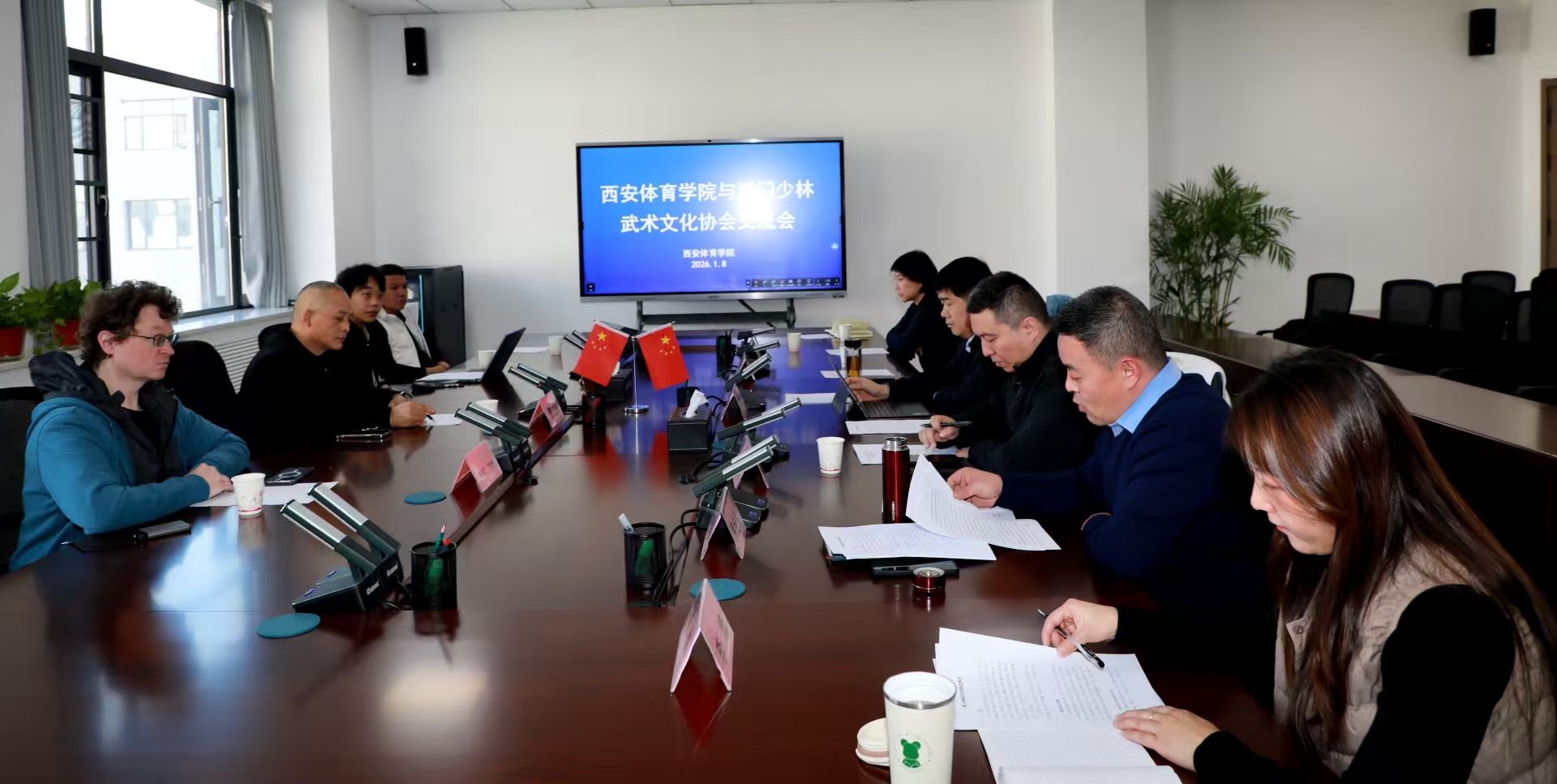 2026年1月8日,澳门少林武术文化协会会长曹文亭、理事长曹源一行莅临我校开展武术交流活动。我校副校长毕德鹏、武术学院院长袁金宝、套路教研室主任罗雪琳、马文国教授、国际交流与合作处全体人员共同参会。
