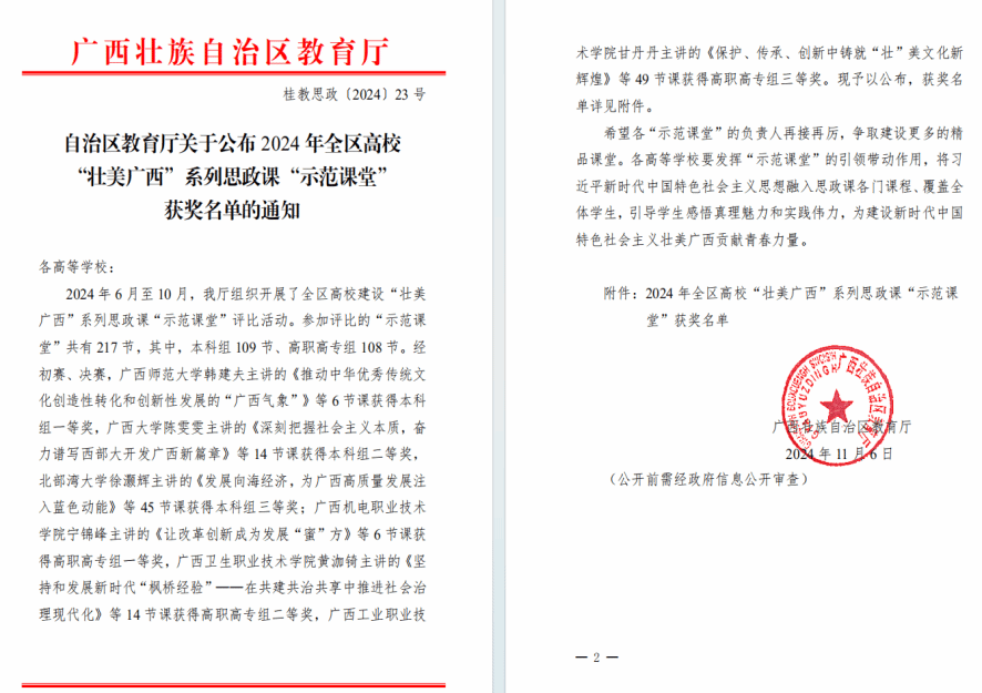 近日,广西英华国际职业学院再接喜讯!广西壮族自治区教育厅正式揭晓了2024年全区高校“壮美广西”系列思政课“示范课堂”的评选佳绩,马克思主义学院黄培强老师凭借其思政课教学的杰出贡献,荣耀摘得三等奖桂冠。这一殊荣不仅是对黄培强老师个人教学卓越成就的颂扬,更是对马克思主义学院整体教学水平的深度肯定。此前,黄培强还荣获2023年广西职业院校老师教学技能课堂教学比赛高职组三等奖、校级“优课优酬”表彰等多项教育教学奖项,并被聘为中国新高教集团精彩课堂内训师,学生评教位列马克思主义学院前茅。