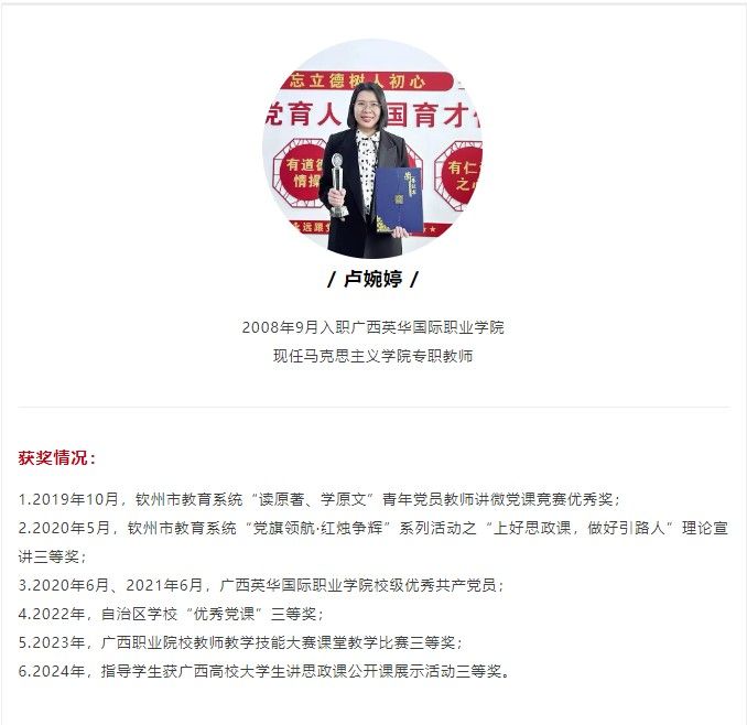 近日,钦州市教育系统第一届“优秀思政课教师”评选活动结果揭晓,广西英华国际职业学院的卢婉婷老师凭借扎实的理论功底、创新的教学实践和真挚的育人情怀,从众多候选人中脱颖而出,获此殊荣。这份荣誉不仅是对卢婉婷老师十年如一日深耕思政教育的肯定,也彰显了学校在新时代思政育人工作中的显著成效。