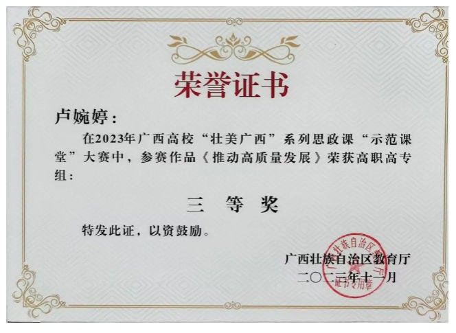 “教学竞赛不是一个人的战斗,而是团队智慧的碰撞。”卢婉婷老师重视与团队的共同成长。在学校精彩课堂大赛、广西职业院校教师教学技能大赛中,团队成员反复推敲教学案例,共同探讨理论讲解的穿透力,细究课件中每个内容的呈现形式。“每一次备赛,浓烈的团队荣誉感会支撑我们把事情做好,做得漂亮。”卢婉婷老师说。