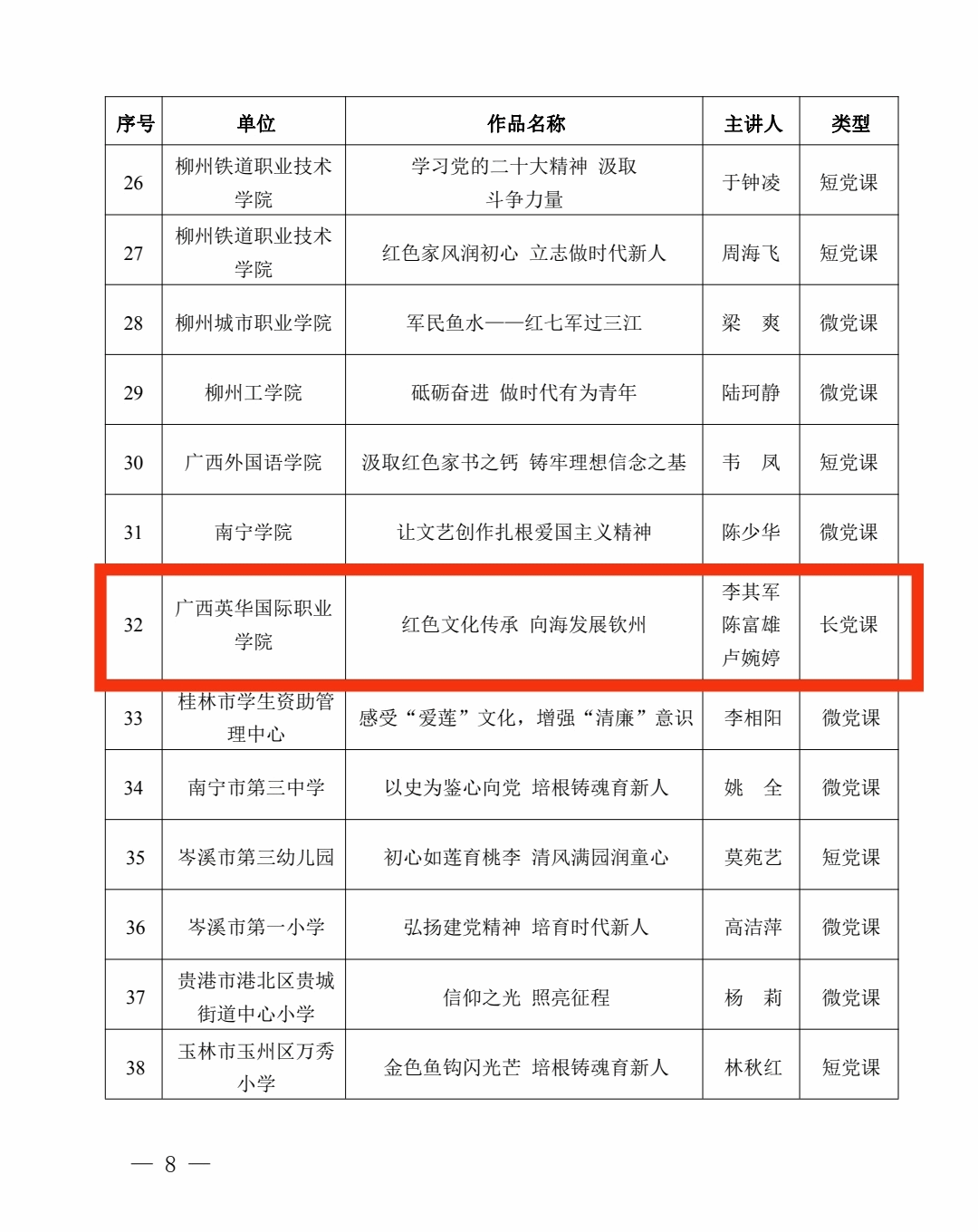 近日,由广西壮族自治区党委教育工委举办的2022年度全区学校“优秀党课”和“党员教育好讲师”比赛结果出炉,马克思主义学院老师李其军、陈富雄、卢婉婷的参赛作品《红色文化传承 向海发展钦州》荣获“优秀党课”三等奖。