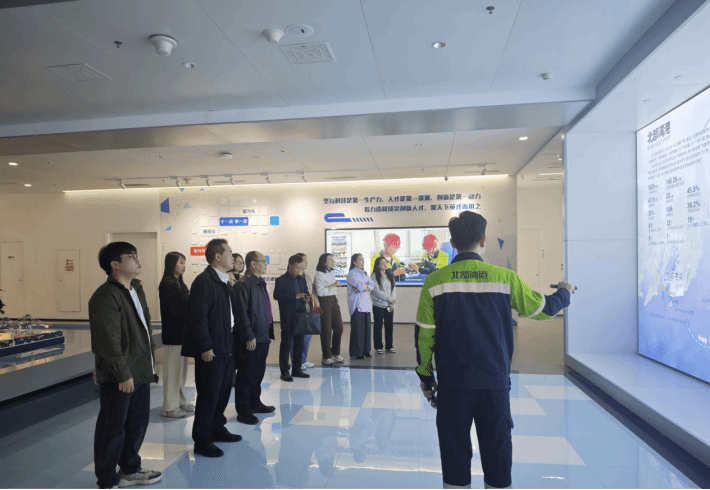 抵达盛港码头后,讲解员热情接待了参观团队,并详细介绍了码头的建设历程与技术优势。盛港码头作为全球首个“U”型工艺布局的全自动化集装箱码头,采用了先进的自动化设备和智能化管理系统。讲解员通过沙盘模型和实地展示,向参观团队介绍了码头的自动化作业流程、智能调度系统以及绿色节能理念。参观团队对码头的智能化设备、高效作业流程以及创新管理模式表现出浓厚兴趣,并就相关技术细节与讲解员进行了深入交流。