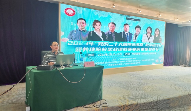2023年2月10-12日,“党的二十大精神进课堂”教学研讨会暨共建院校思政课教师寒假集体备课会培训班在南宁召开,我院梁淳一院长带领全体思政教师参会。会议采用线上线下相结合的方式进行,安排了专家报告、示范课展示、经验交流发言三个议程。