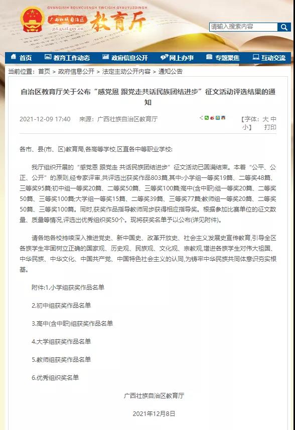 由广西教育厅举办的征文比赛是“庆祝中国共产党成立100周年铸牢中华民族共同体意识”系列活动之一,分小学组、初中组、高中组、大学组、教师组。其中,大学组一等奖15篇、二等奖39篇、三等奖77篇;教师组一等奖20篇、二等奖50篇、三等奖100篇。