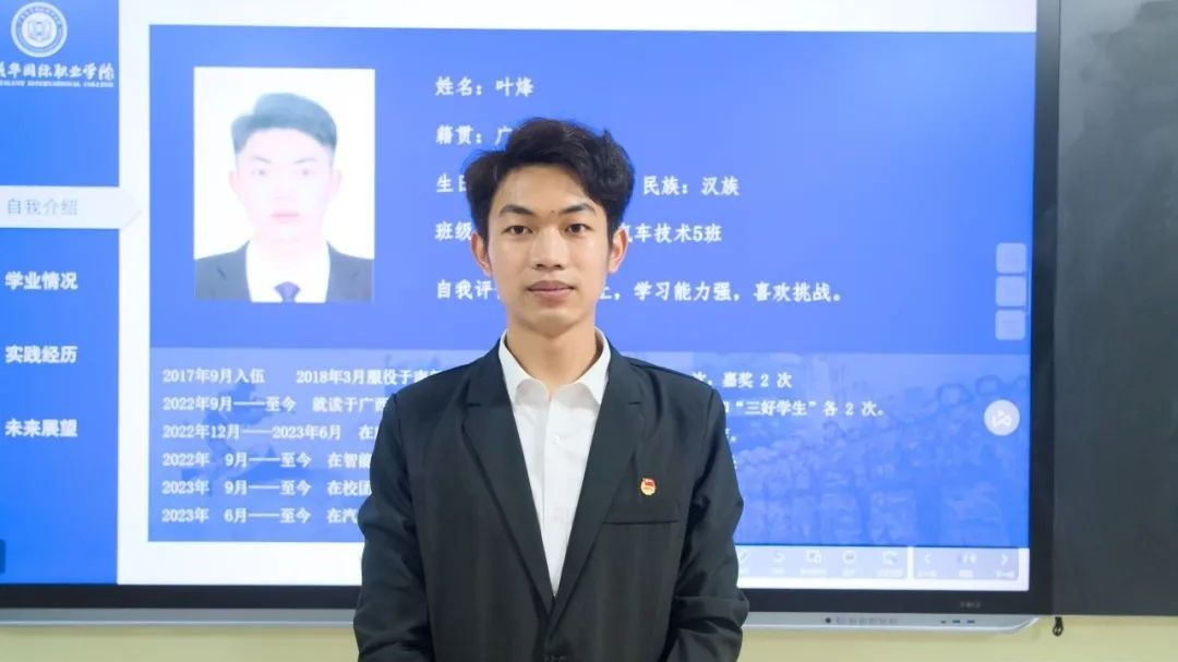 叶烽,共青团员,十佳优秀大学生,现任校团委学生副书记、汽车爱好者协会副会长、2022级新能源汽车技术5班班长。多次参加并组织校团委举办的各类活动。工作认真踏实,积极负责,责任心强。具有强烈的集体观念,劳动积极肯干。学习目标明确,态度认真,勤于钻研,善于思考,学风扎实,时间观念强,能吃苦耐劳,乐于助人,尊敬师长。曾连续两次荣获“三好学生”、两次荣获“优秀学生干部”,并获得“优秀共青团干部”称号,多次荣获“...