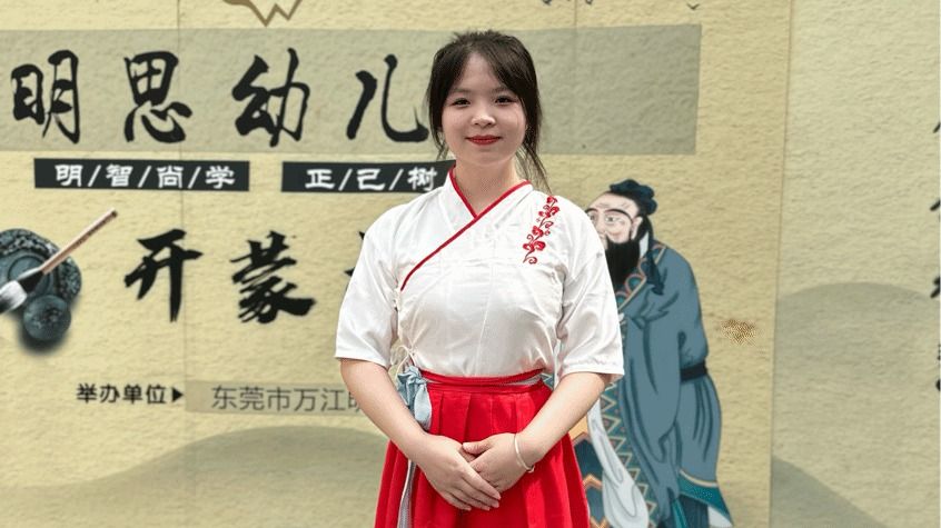 8月,刚结束了钦州党校实习的黄雨晗,马不停蹄前往岗位实习地点——广州市花都区的大树小苗家庭教育有限公司,正式成为了一名英语教师。