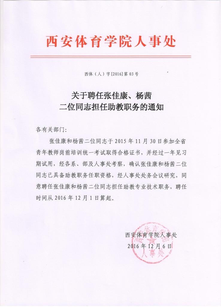 关于聘任张佳康、杨茜两位同志担任助教职务的通知