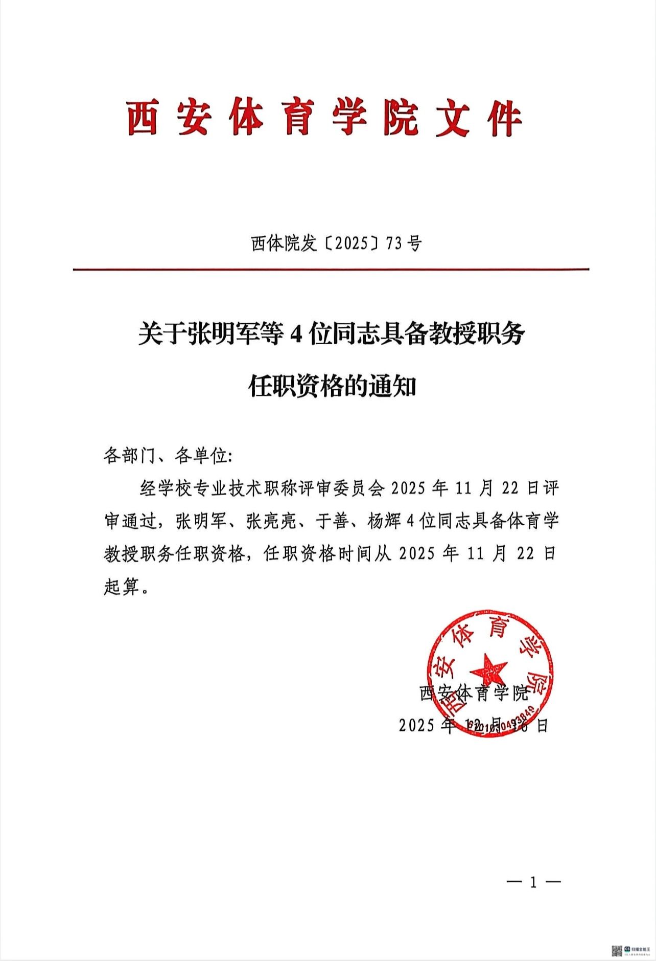 关于张明军等4位同志具备教授职务任职资格的通知