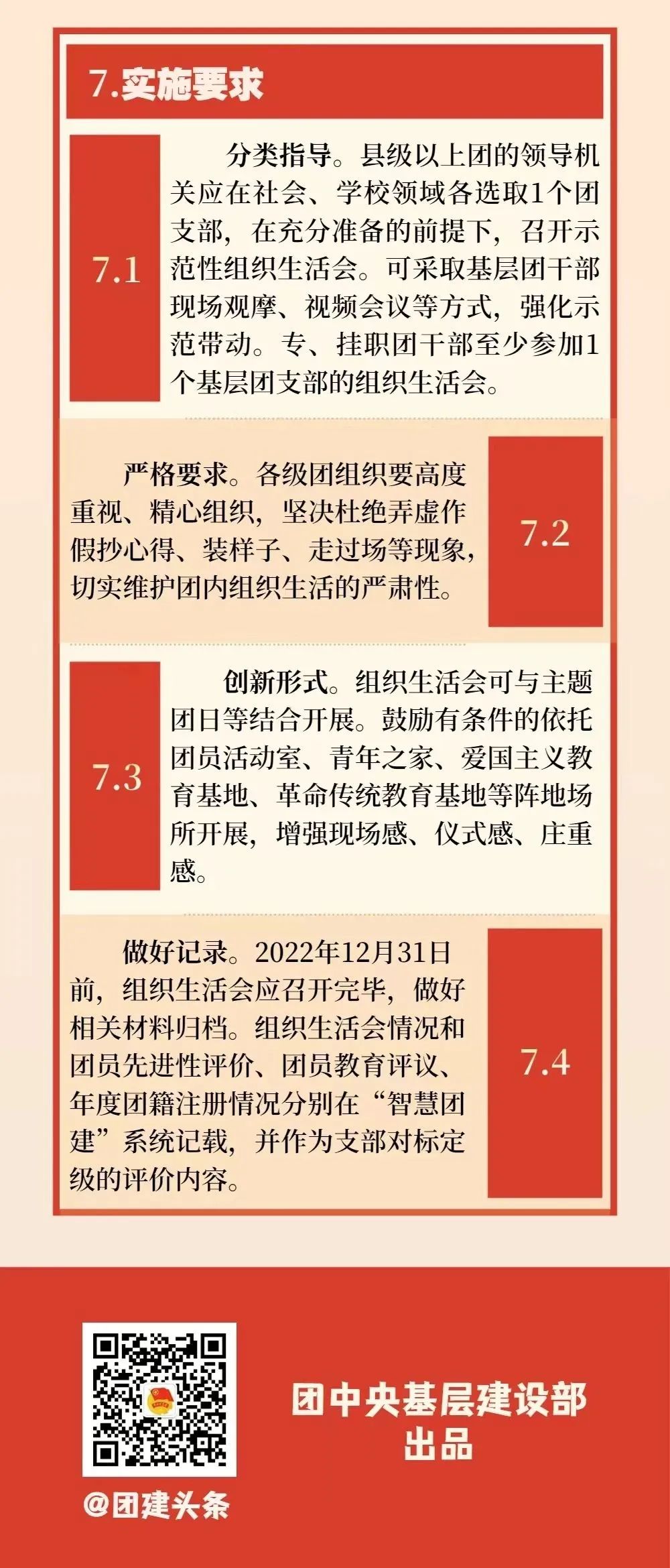 7.3 创新形式。组织生活会可与主题团日等结合开展。鼓励有条件的依托团员活动室、青年之家、爱国主义教育基地、革命传统教育基地等阵地场所开展,增强现场感、仪式感、庄重感。